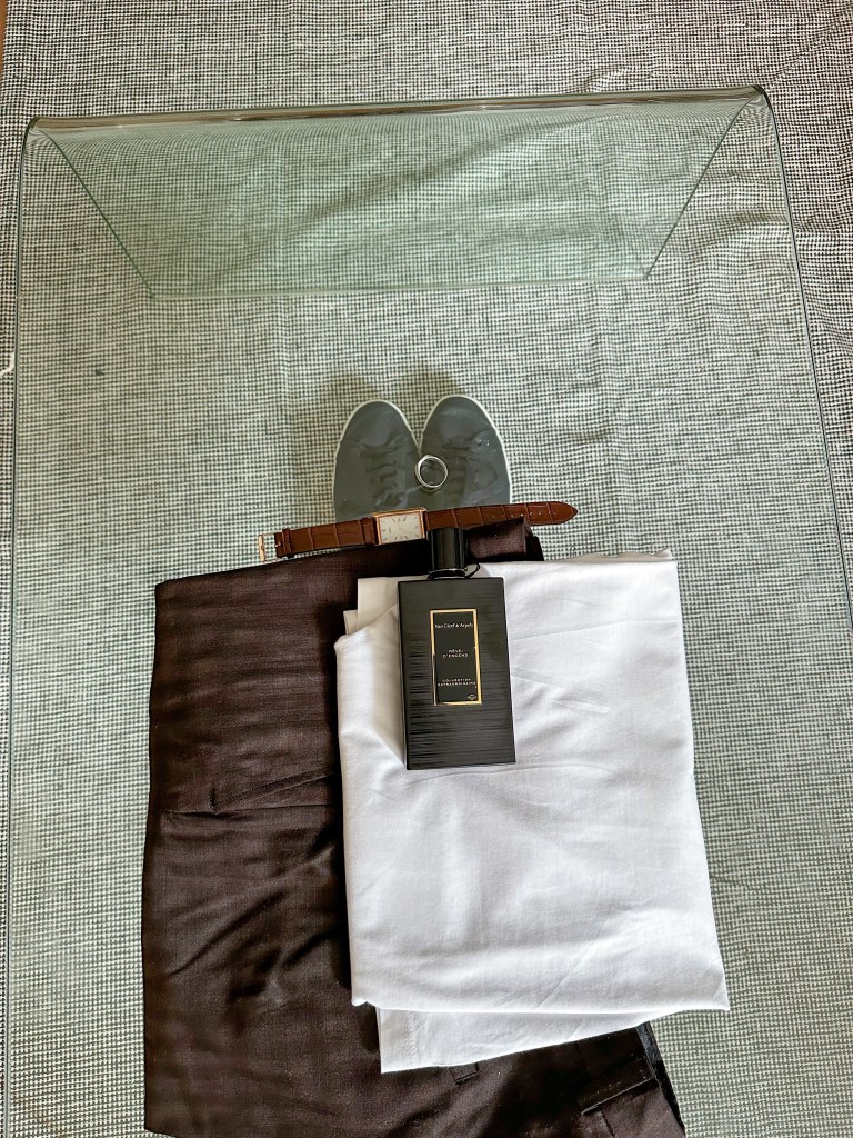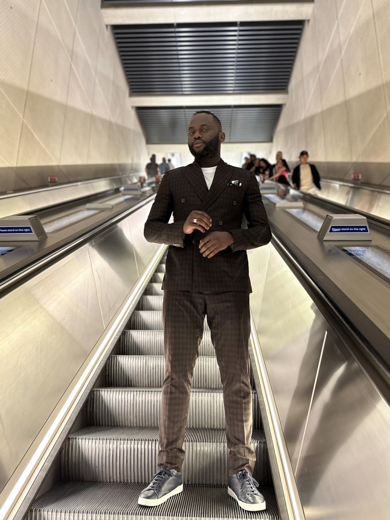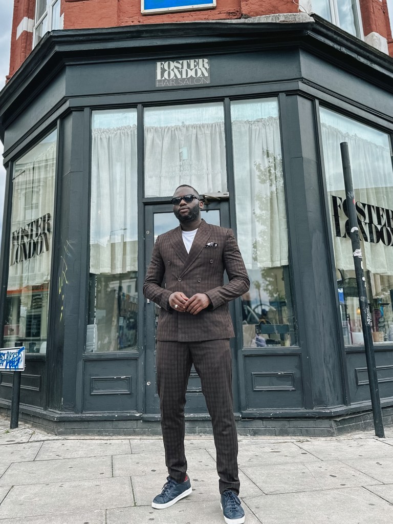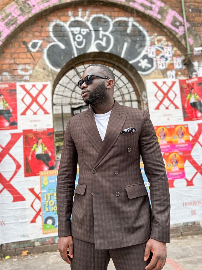Today’s outfit of the day features a stylish brown checkered double-breasted suit, paired with a white t-shirt and blue plimsolls, creating a casual yet sophisticated look with a delightful contrast of colors.