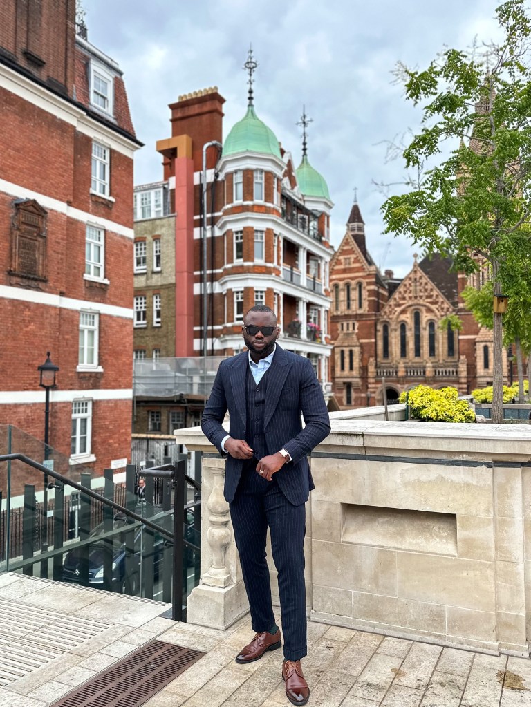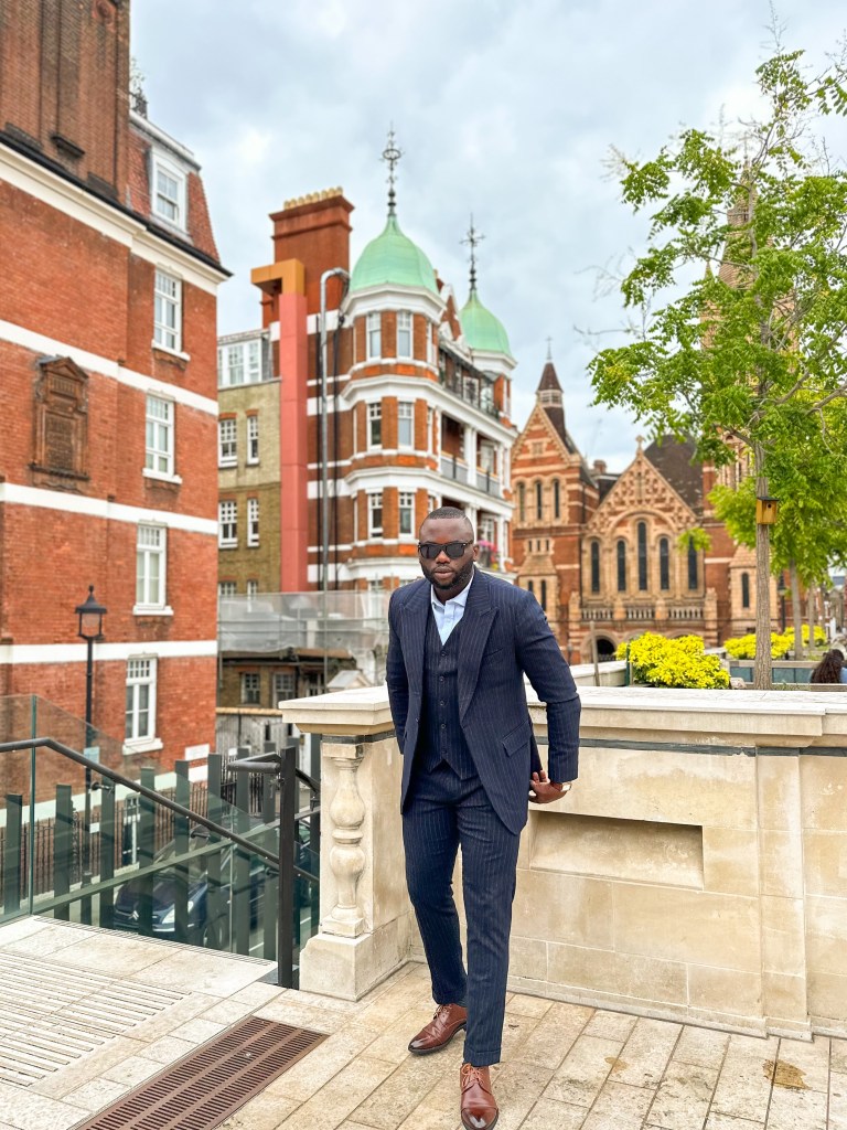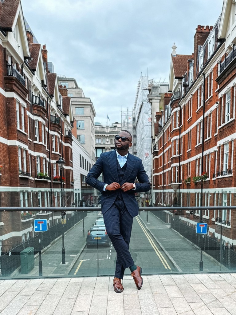 Today I’m Embracing elegance in a three-piece black pinstripe suit. Complemented by a charming sky blue shirt and a delightful pop of contrast with green socks match with a brown shoe.