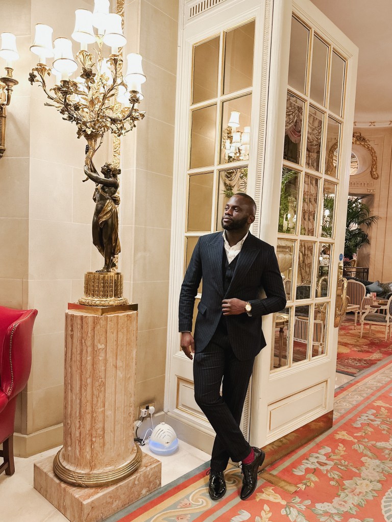 Monochrome for the win today ! My pick for today is a 3 piece black stripe suit layered with a white shirt and red socks for pop of colour.