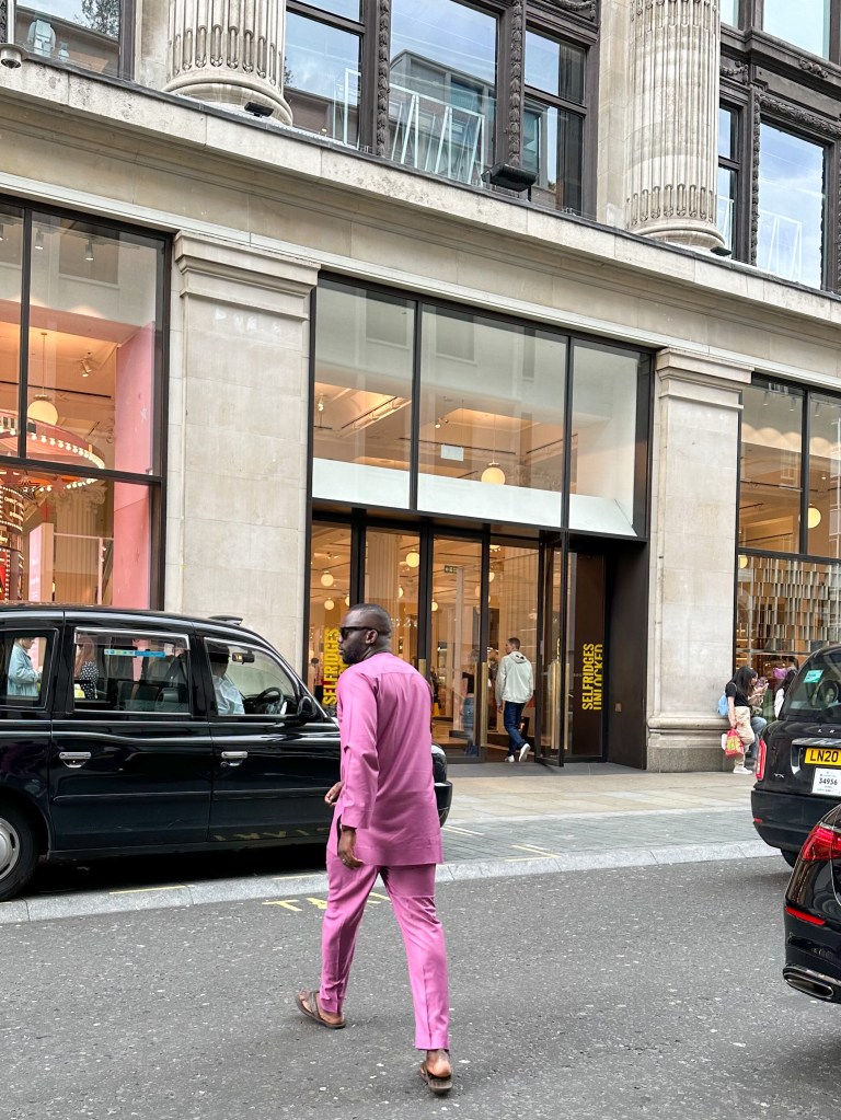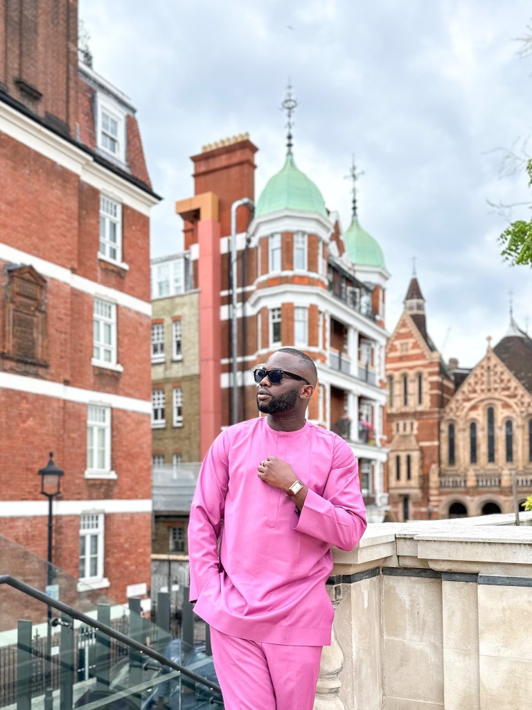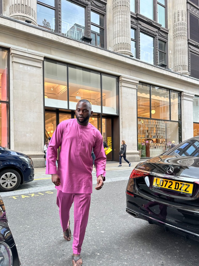 I’m wearing a minimalist pink kaftan, crafted without embroidery, and complementing it with a brown wristwatch and slippers. This outfit is available in various sizes at http://www.twelve19styles.com. As per tradition in my culture, we adorn kaftans on Fridays and occasionally on other days..