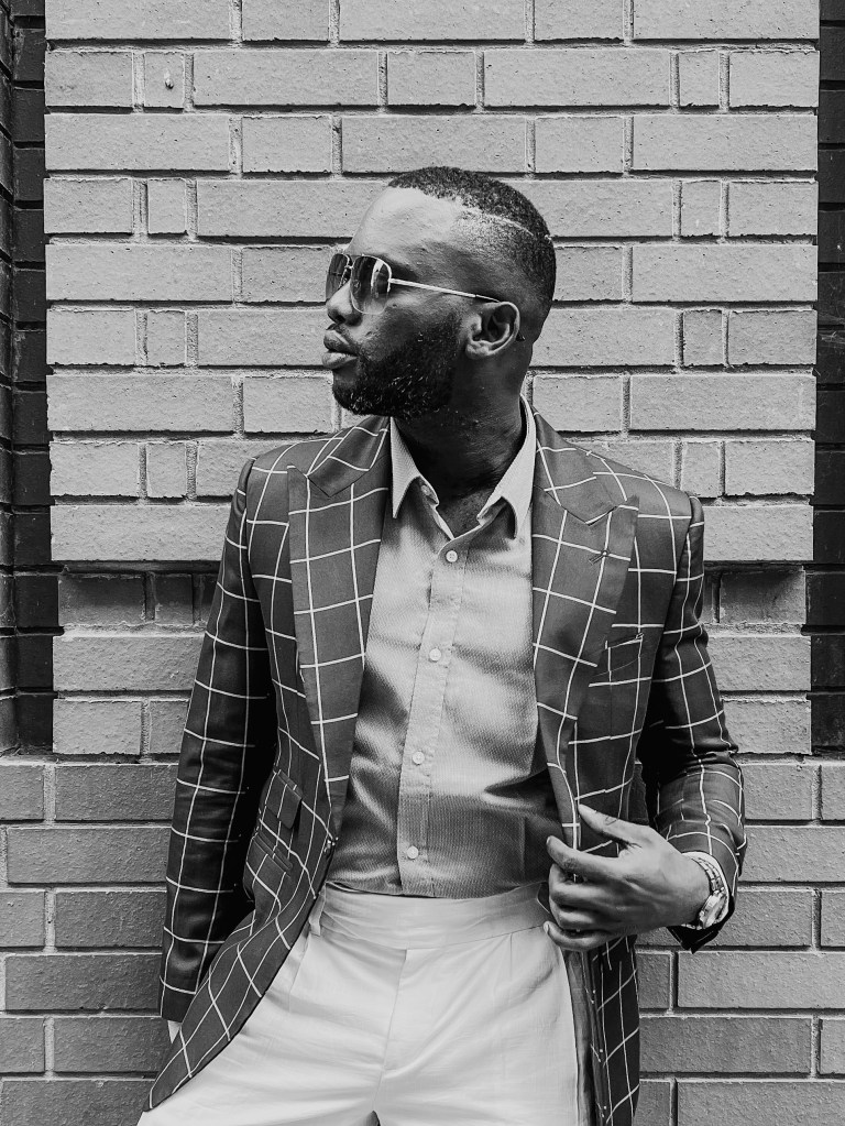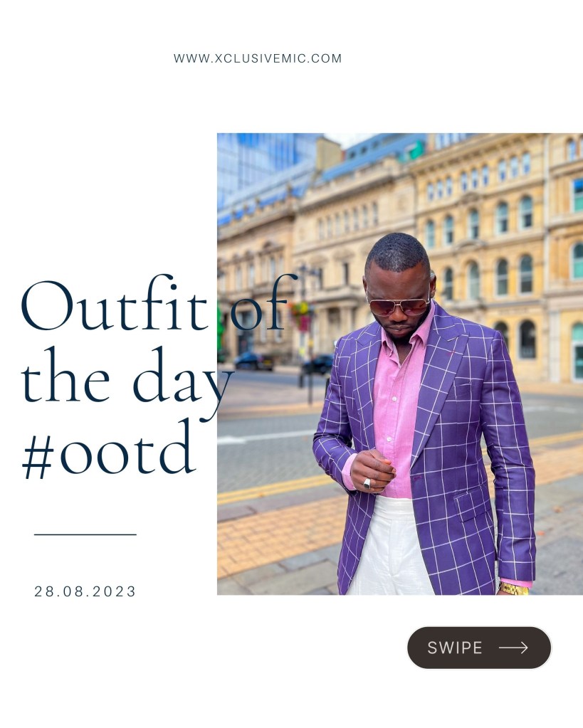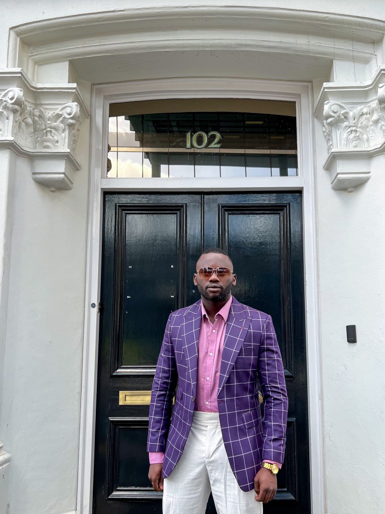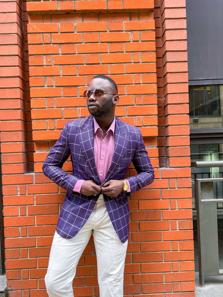 Today’s outfit is a purple checkered suit with a pink shirt and white trousers. I chose the pink shirt to go well with the purple suit, and the white trousers help balance the colors and match the white lines on my jacket.