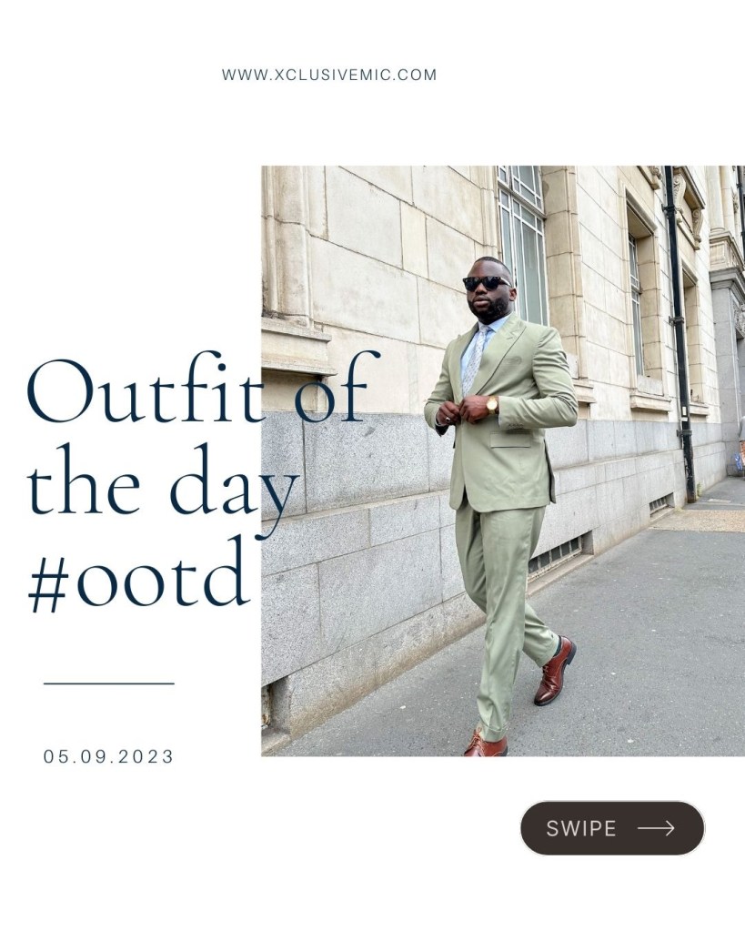 Today’s ensemble: A sage green suit paired with a sky blue shirt, complemented by green socks and an ash tie adorned with blue polka dots. It’s all about those stylishly connecting dots.