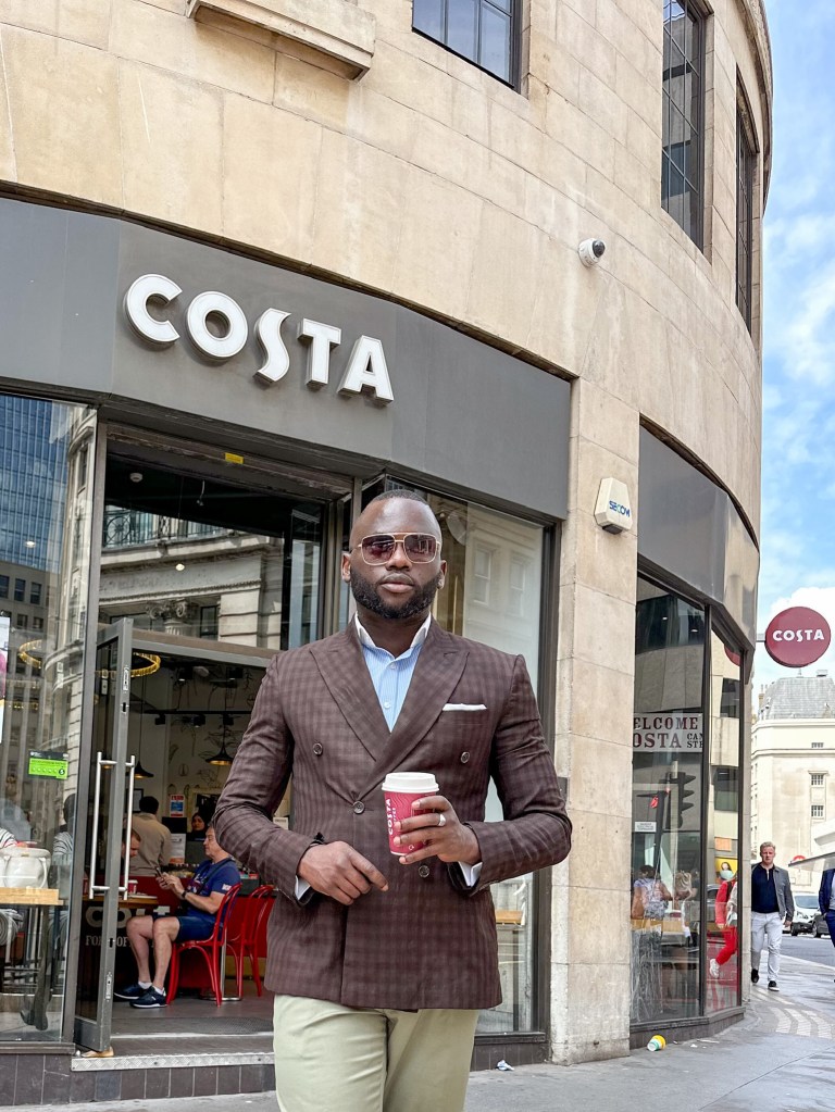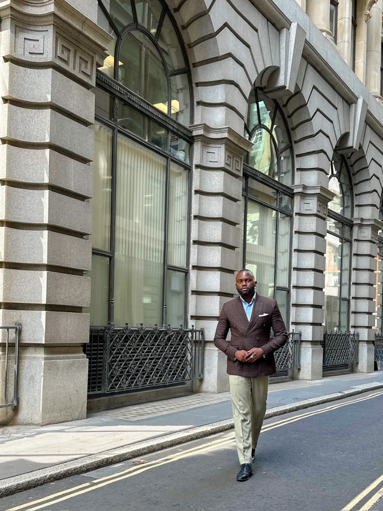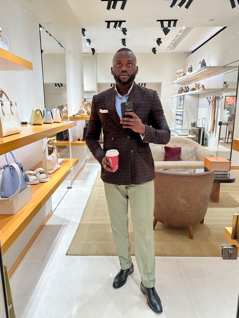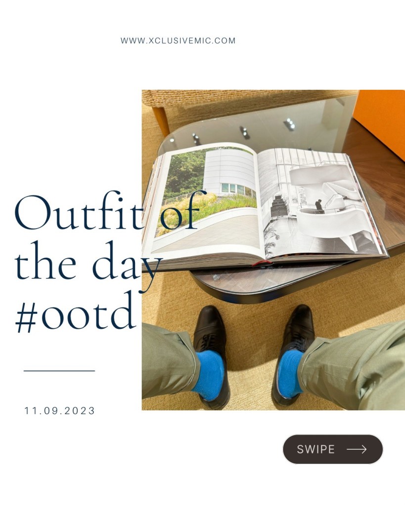 Today’s outfit of the day showcases a stylish blend of four colors: a rich chocolate brown double-breasted jacket, a blue shirt with a contrasting white collar, paired with sage green trousers. Complementing the look, blue socks coordinate with the shirt, and a white pocket square elegantly echoes the shirt collar.