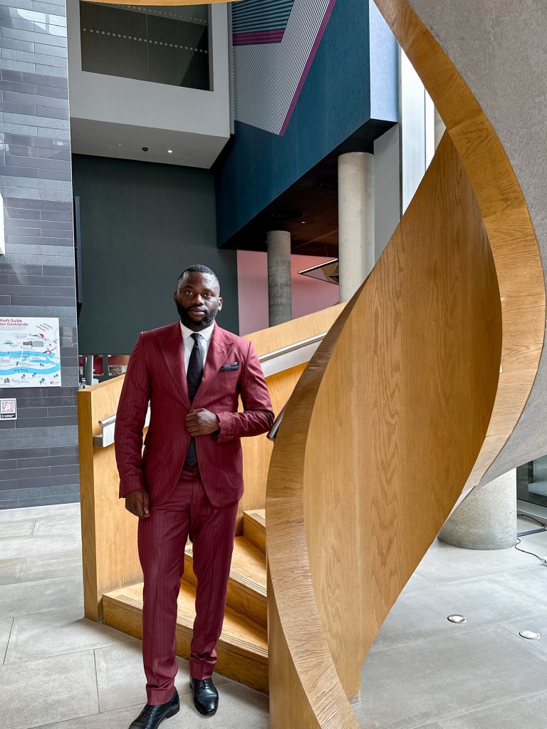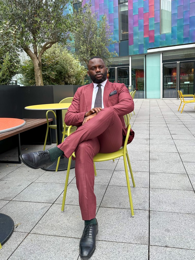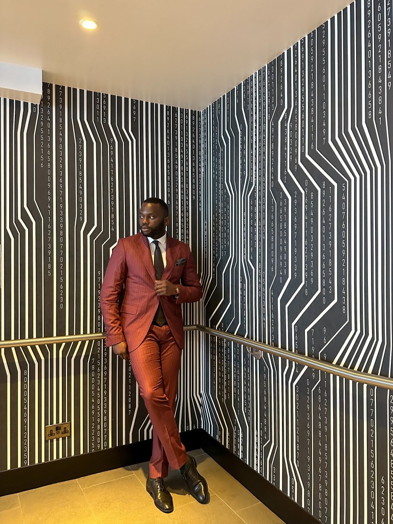 Today’s outfit showcases a burgundy suit adorned with elegant gold stripes, paired with a crisp white shirt, a classic black tie, and a playful touch of style with vibrant green socks. What I truly cherish about crafting this outfit is the ability to achieve a harmonious blend of simplicity and sophistication, all while meticulously attending to every intricate detail.