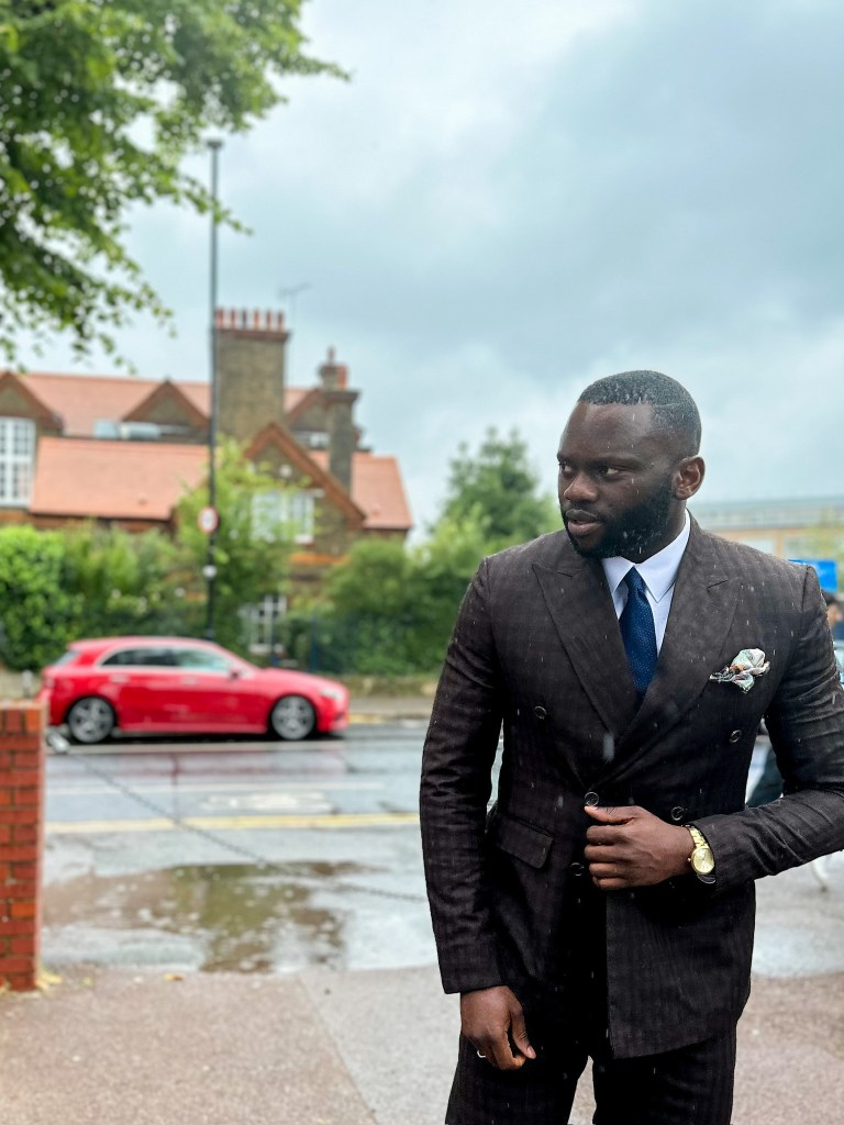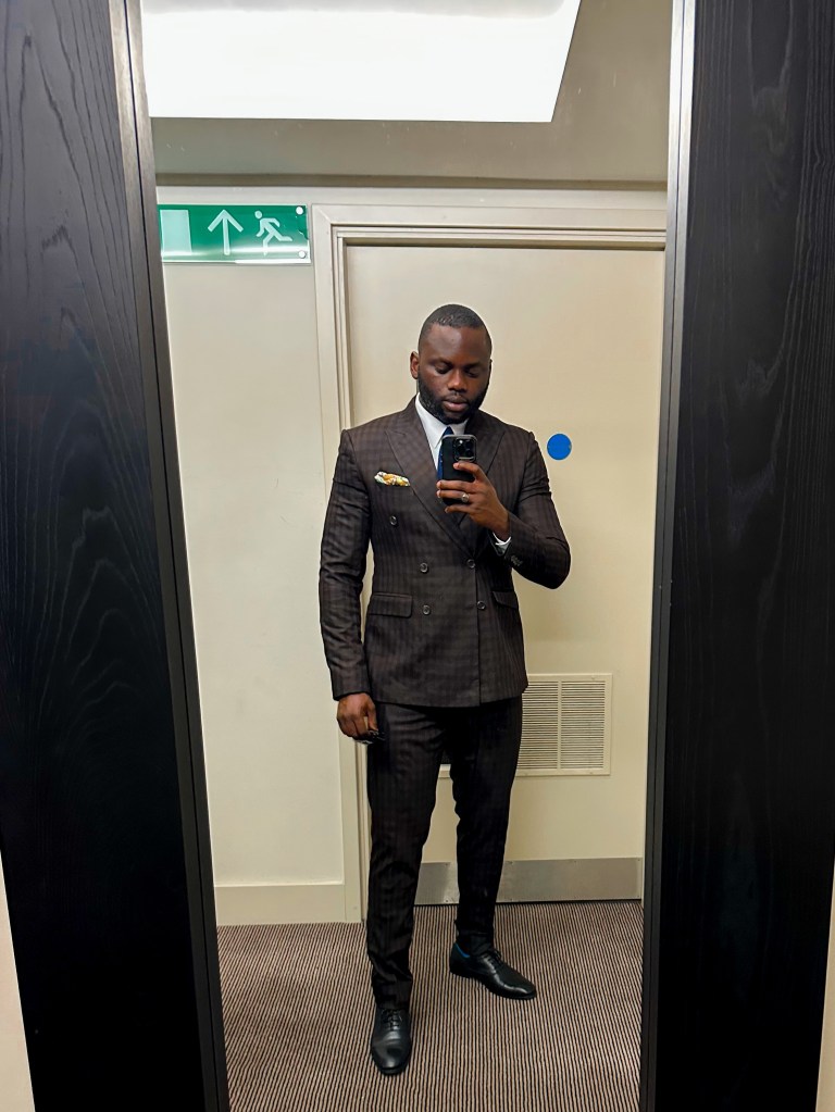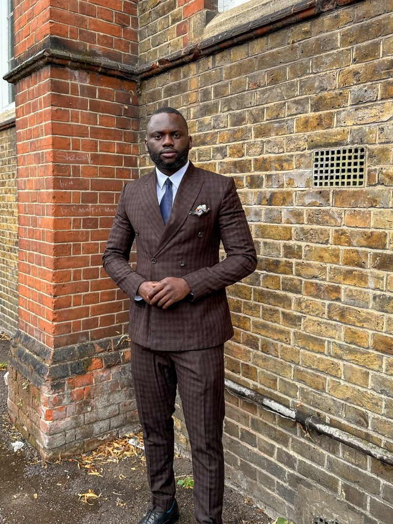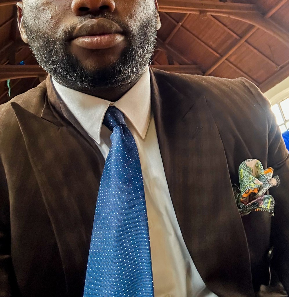 My attire today exudes a minimalist charm: adorned in a rich chocolate-brown suit, complemented by a crisp white shirt and a charming blue polka dot tie, paired with blue socks and a lively floral pocket square. I love the freedom of not needing my pocket square to coordinate with my outfit.