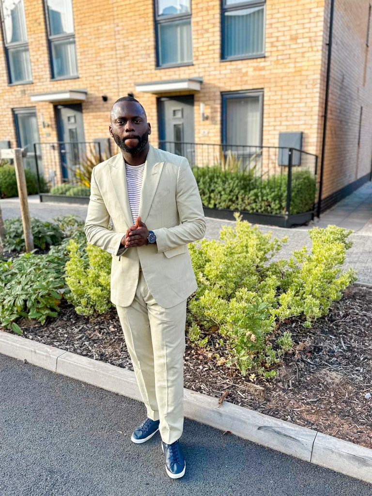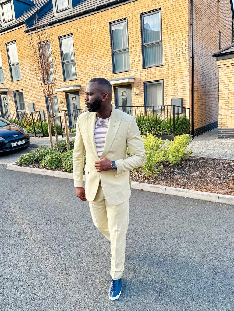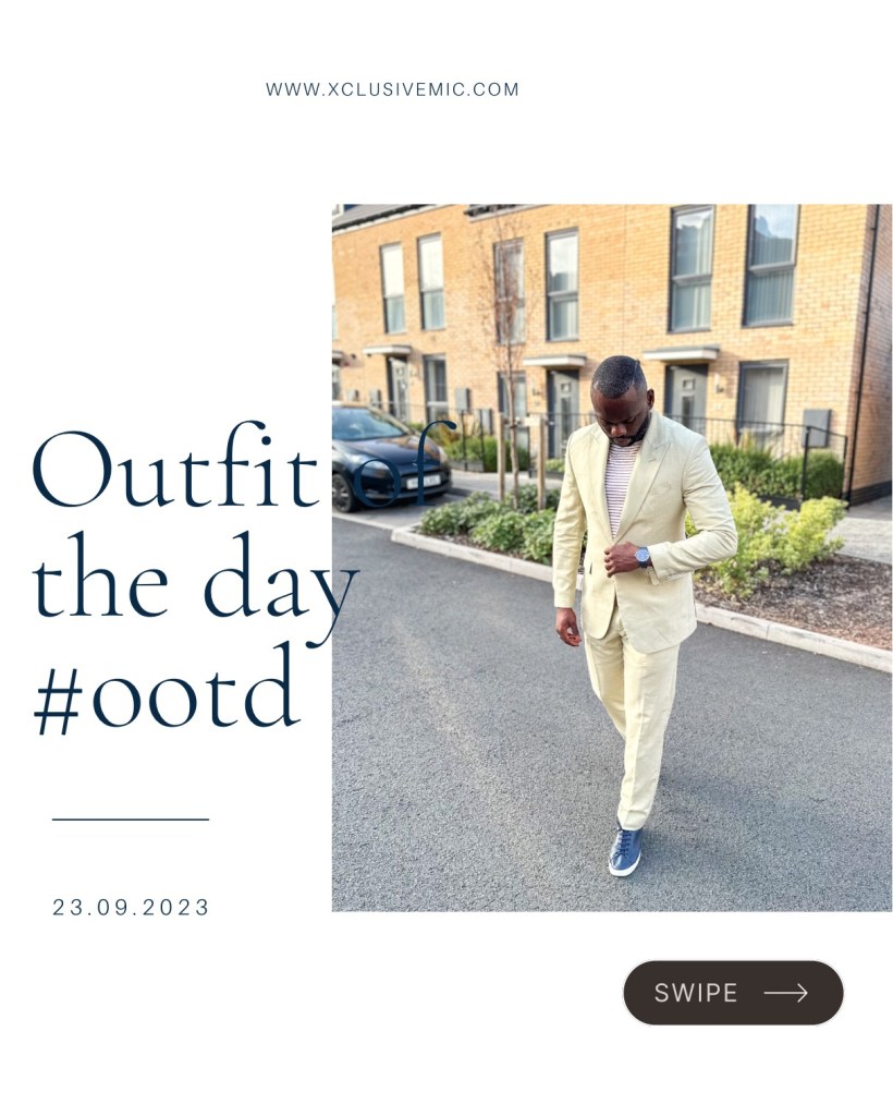 My pick for the day is My choice of attire for the recent wedding I attended as a guest was a sophisticated two-piece beige linen suit, complemented by a comfortable tee and paired with blue pinmsole shoes to match my stylish blue wristwatch. While I adore linen for its breathability, it may not be the most suitable option as we transition into the fall season here in England.