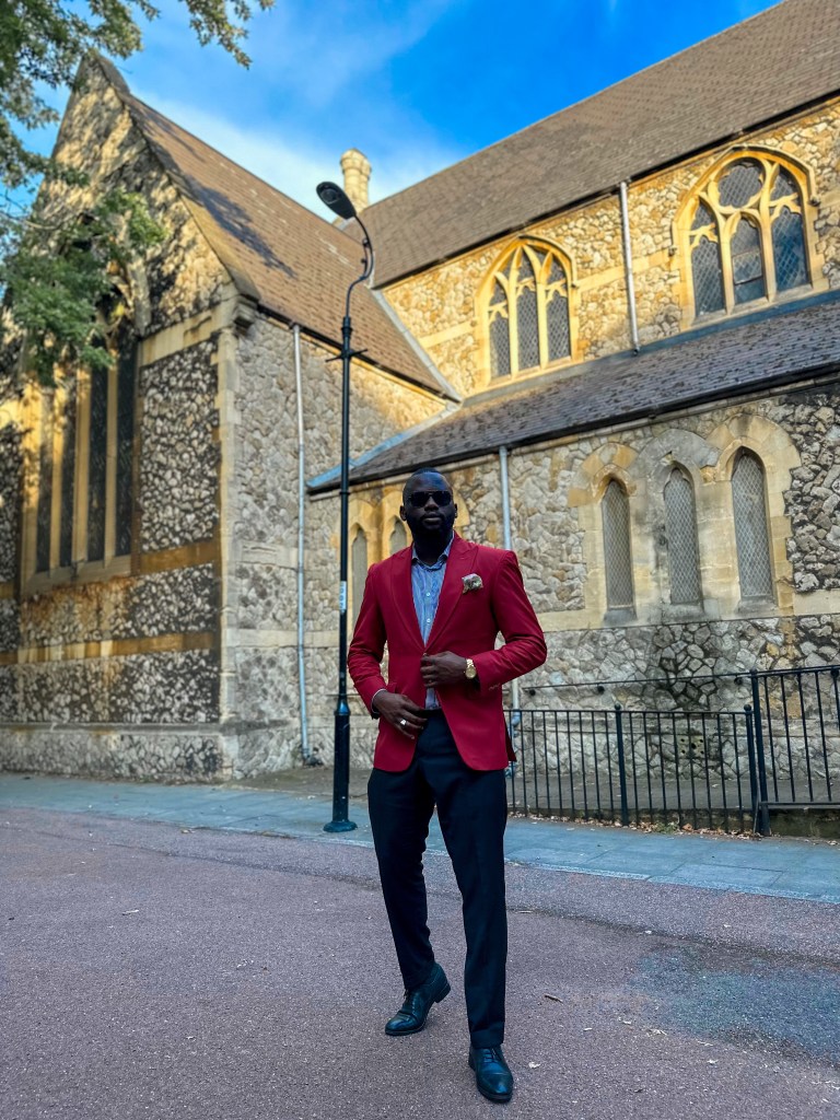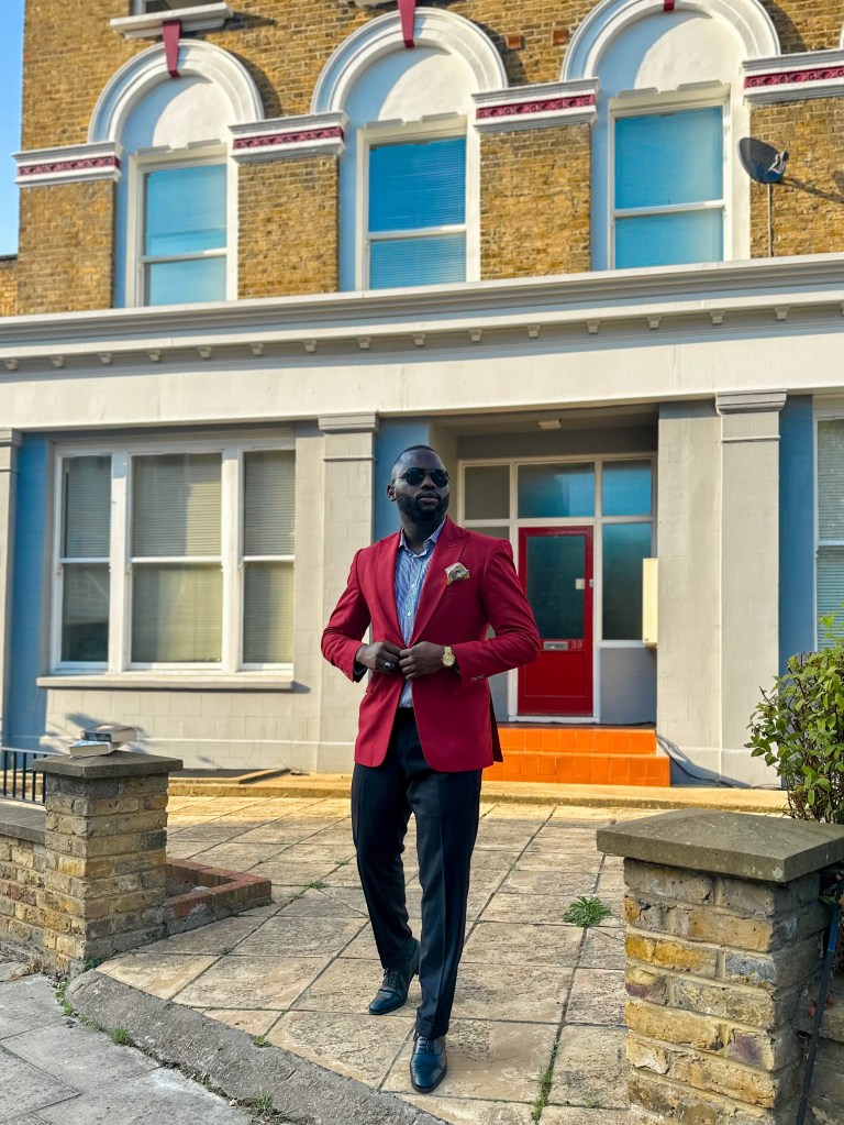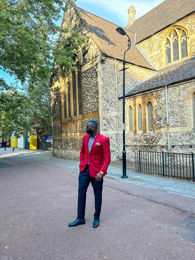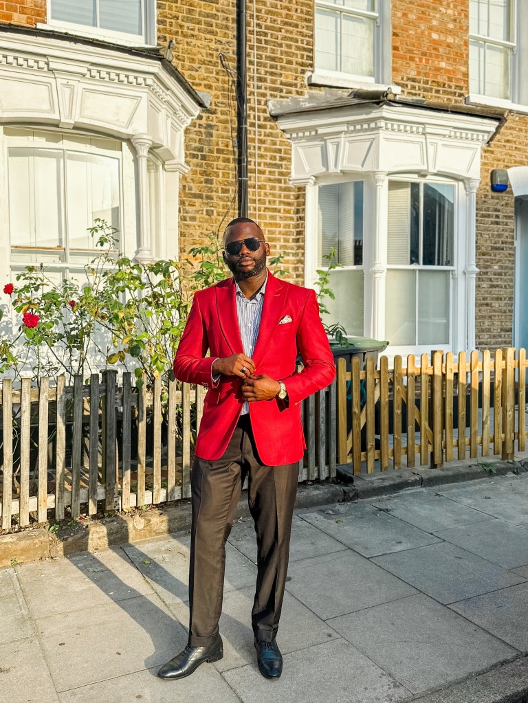 My pick for today, I’ve chosen to wear a vibrant red jacket paired with a stylish blue striped shirt, sharp black trousers, eye-catching green socks, and polished black shoes. I find immense joy in orchestrating the harmony of two or three colors in my outfit; it’s akin to creating a beautiful piece of art through fashion.