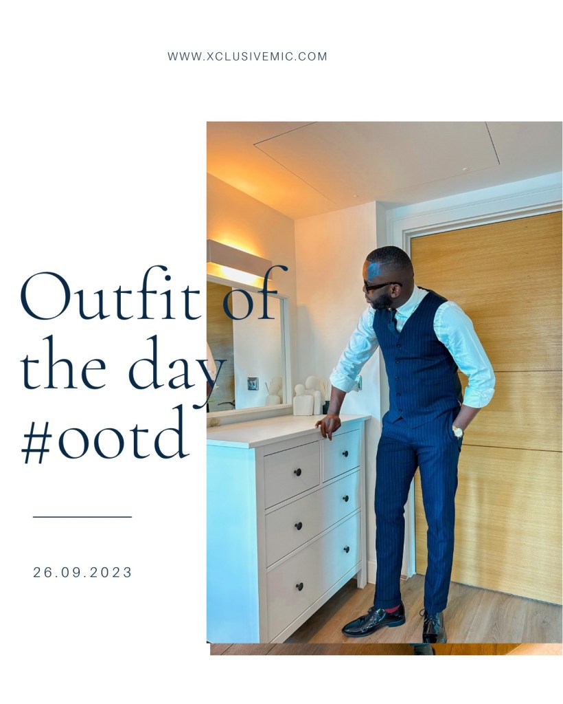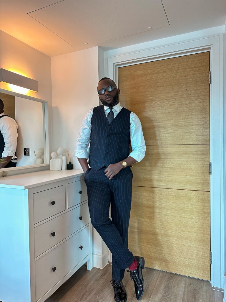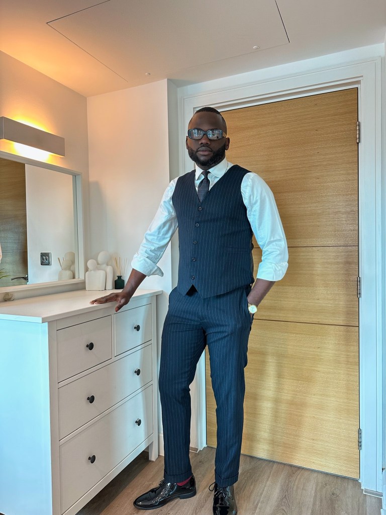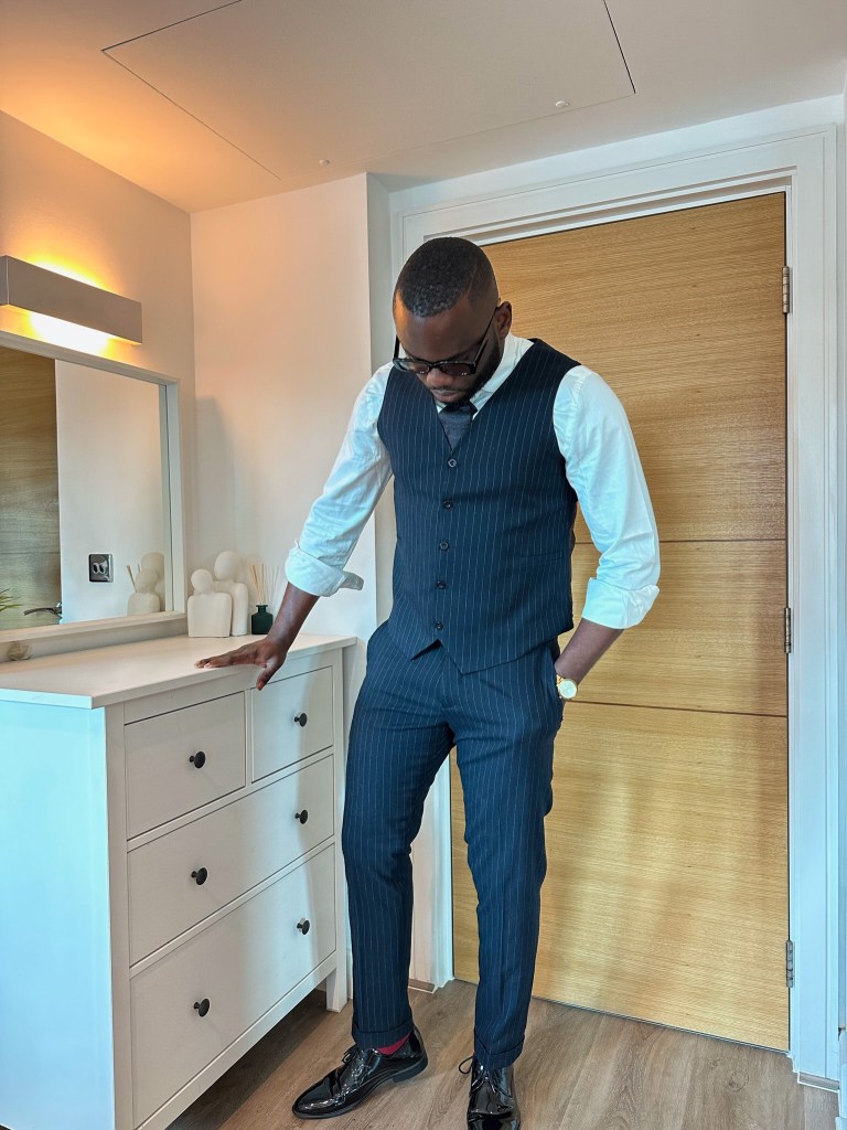 Today’s choice is a corporate casual ensemble: a sleek black striped waistcoat and trousers paired effortlessly with a crisp white shirt. Adding a touch of flair, a black tie adorned with vibrant red polka dots. With sleeves playfully rolled up, it maintains a professional appearance while embracing a more relaxed vibe.