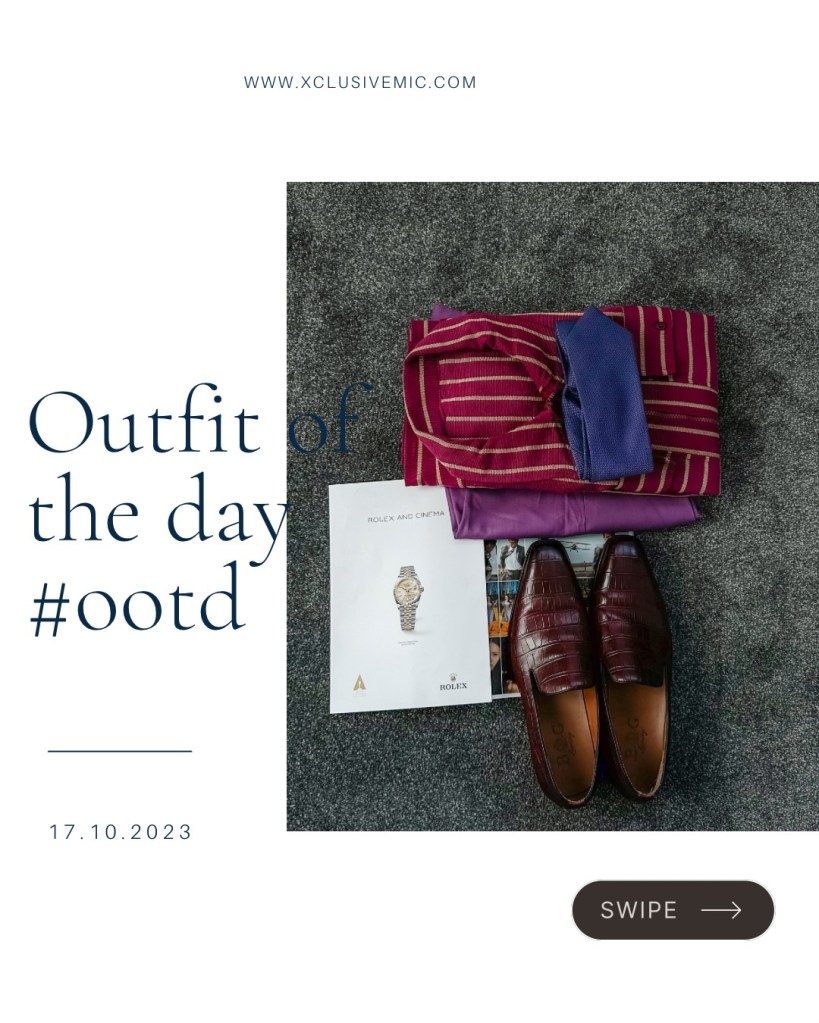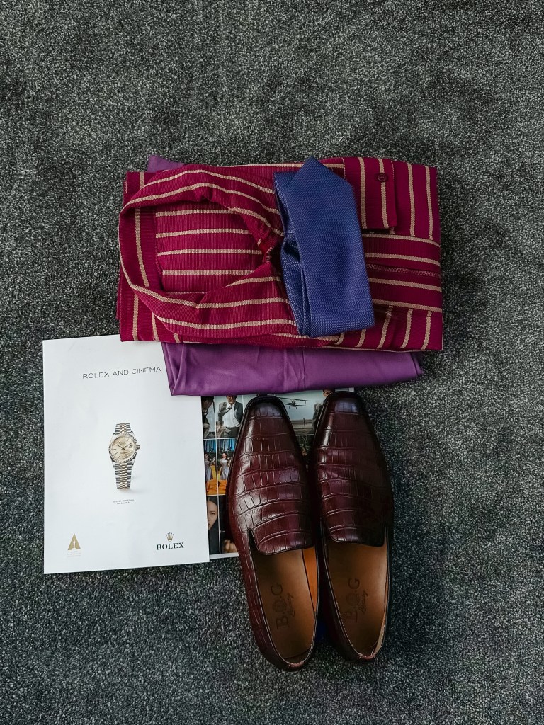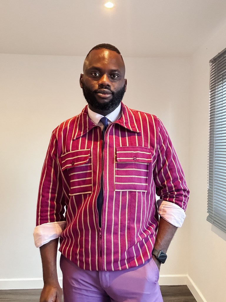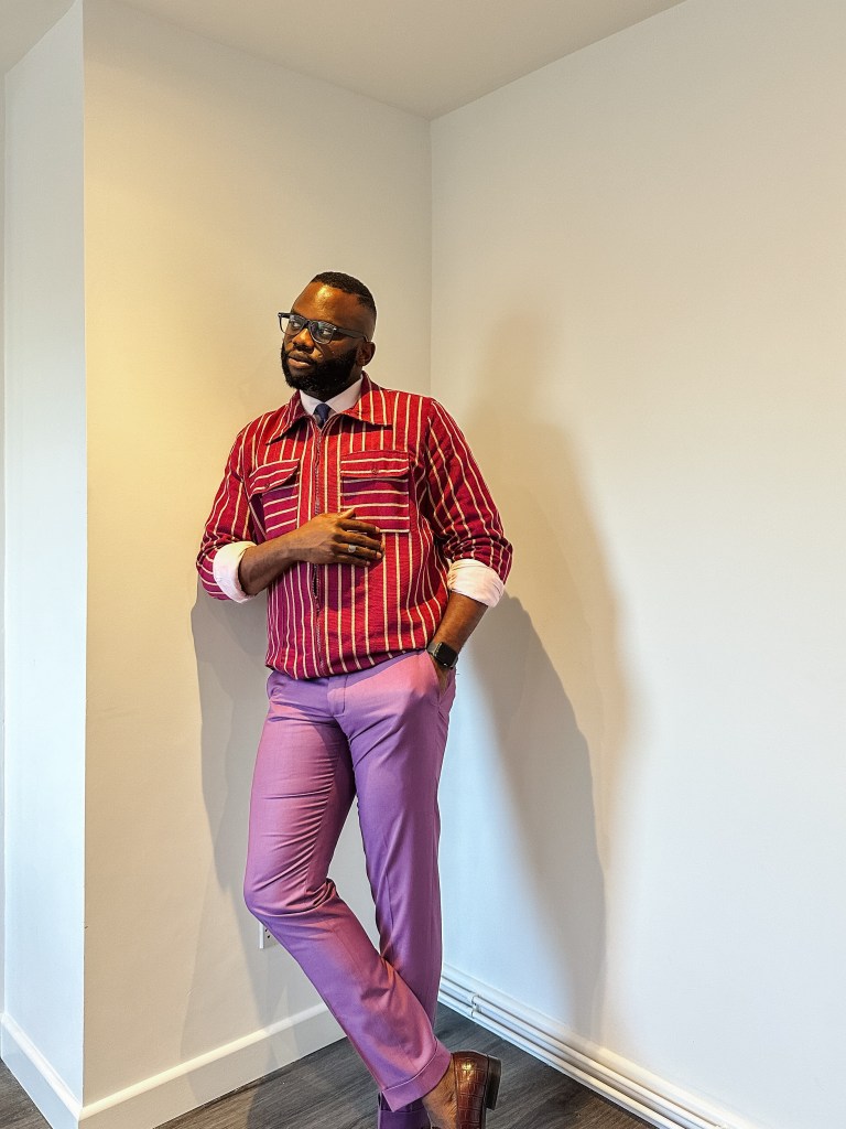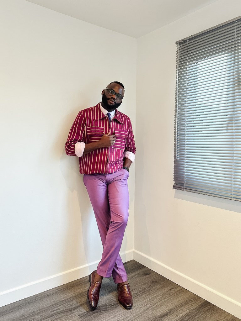 Today’s outfit features a smart-casual look, showcasing a Shacket crafted from the renowned Aso Oke fabric. It’s paired with a pink shirt, lilac trousers, and a deep purple tie for a seamless blend of style