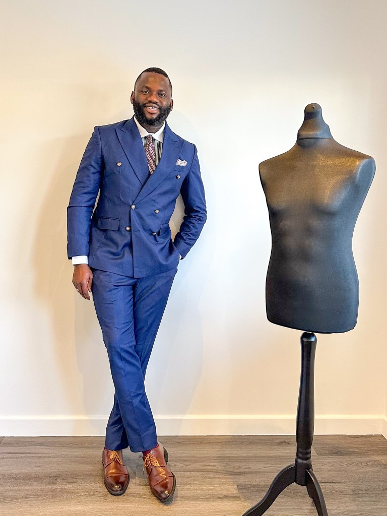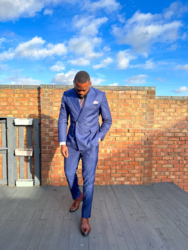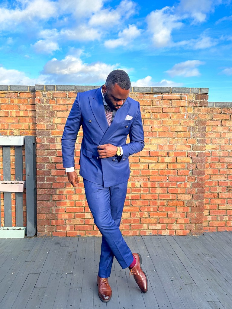 My Monday outfit featured a navy blue double-breasted suit paired with a sharp black striped shirt, enlivened by vibrant wine socks for a touch of contrast and a dash of brown shoes for a subtle yet classy finish. How’s your Monday shaping up? What was your choice of work attire today?