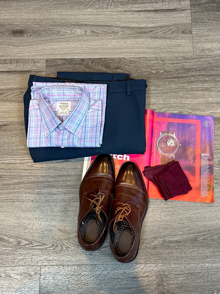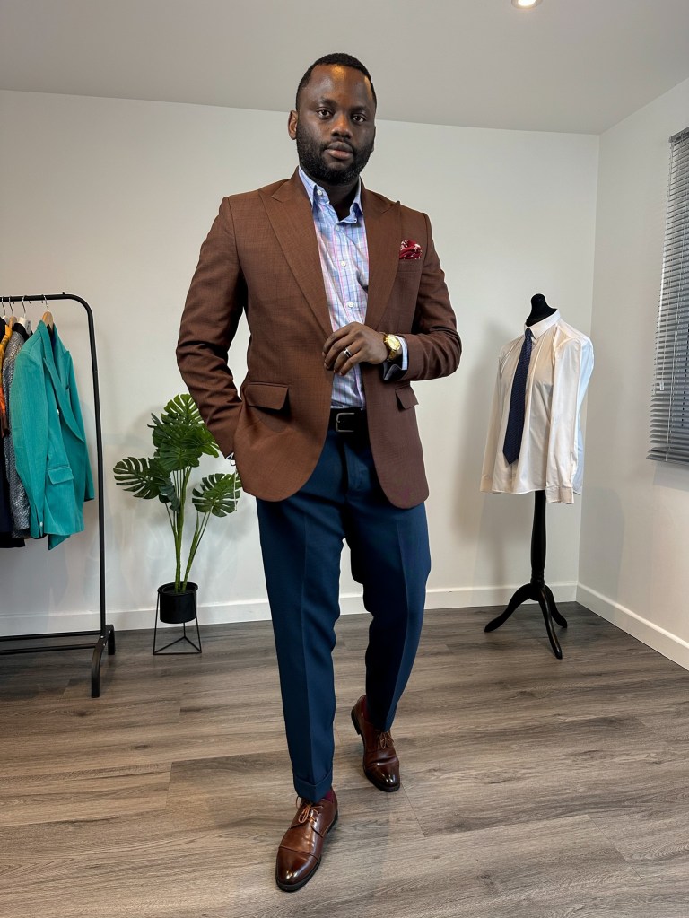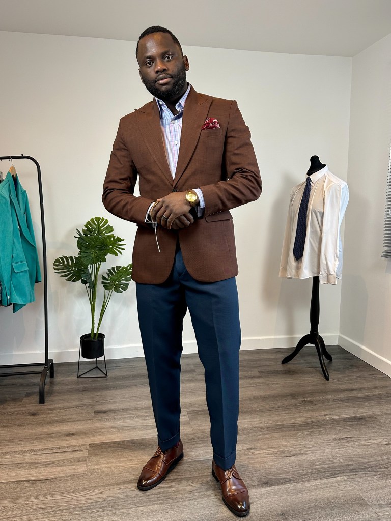 The idea is to match my the burgundy lines of my blue check shirt with my socks and pocket square, the blue shirt to match my navy blue trouser, to create some contrast with the colours, I went for a brown jacket to match with brown shoes. This way I’ve been able to seamlessly match 3 colours together.
