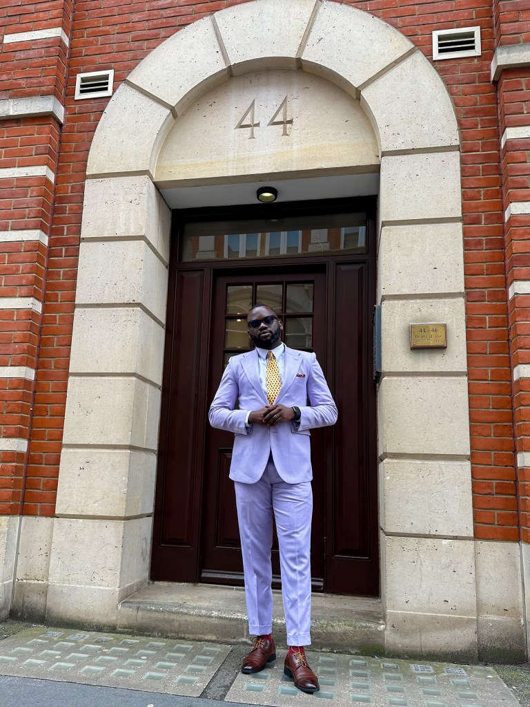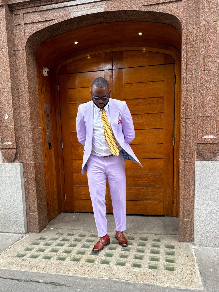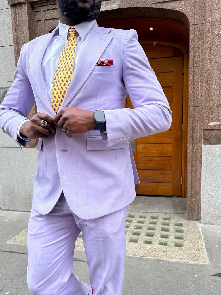 With newfound inspiration, I crafted today’s outfit, pairing the lavender suit with the striking yellow tie. To complement the outfit, I opted for burgundy socks to echo the details of the tie and pocket square.