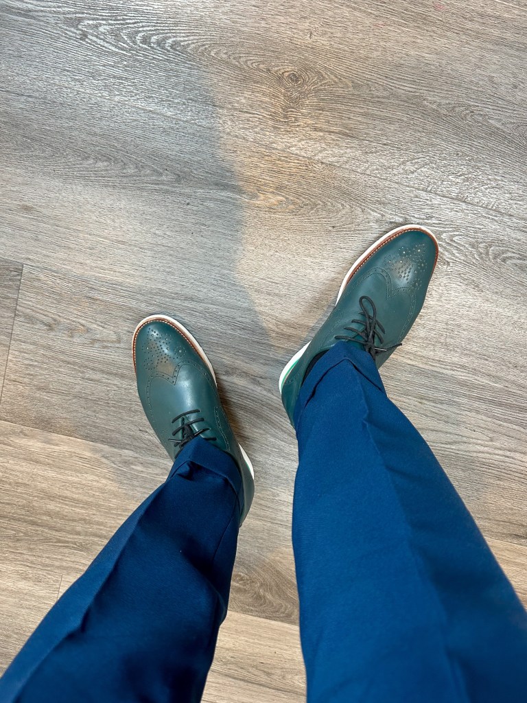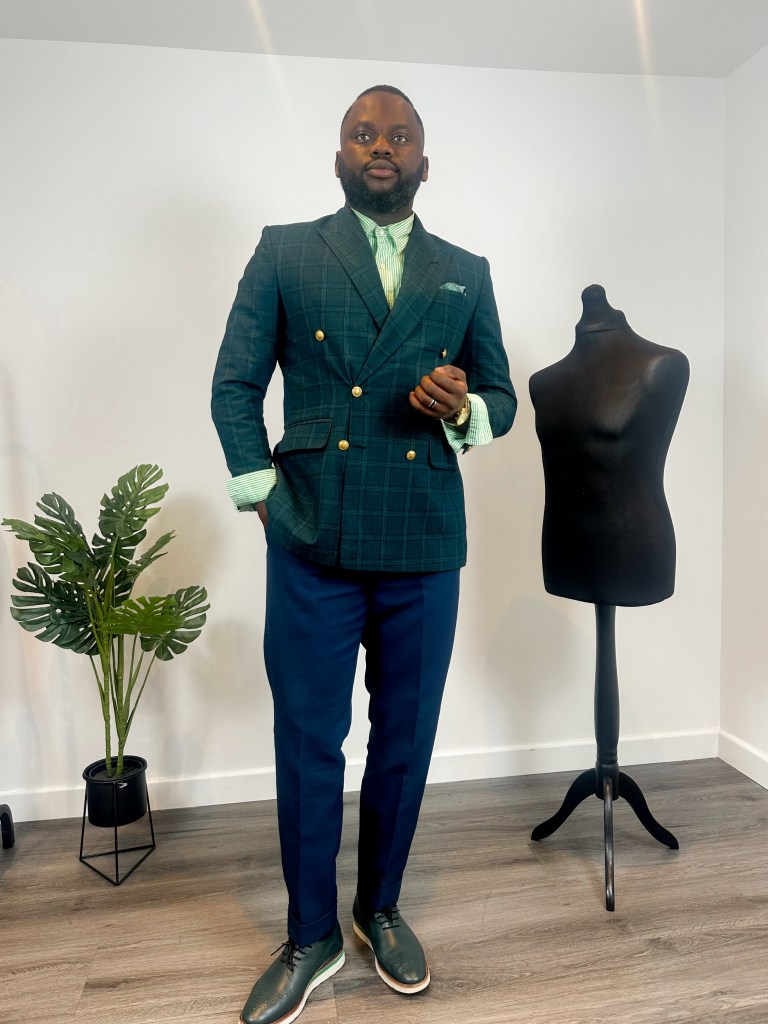 Pairing seamlessly with the blazer is a pair of blue trousers, also from twelve19styles. Tailored to perfection, these trousers strike the perfect balance between comfort and style. The rich blue hue adds depth to the outfit, creating a harmonious contrast with the green shirt and checkered blazer.