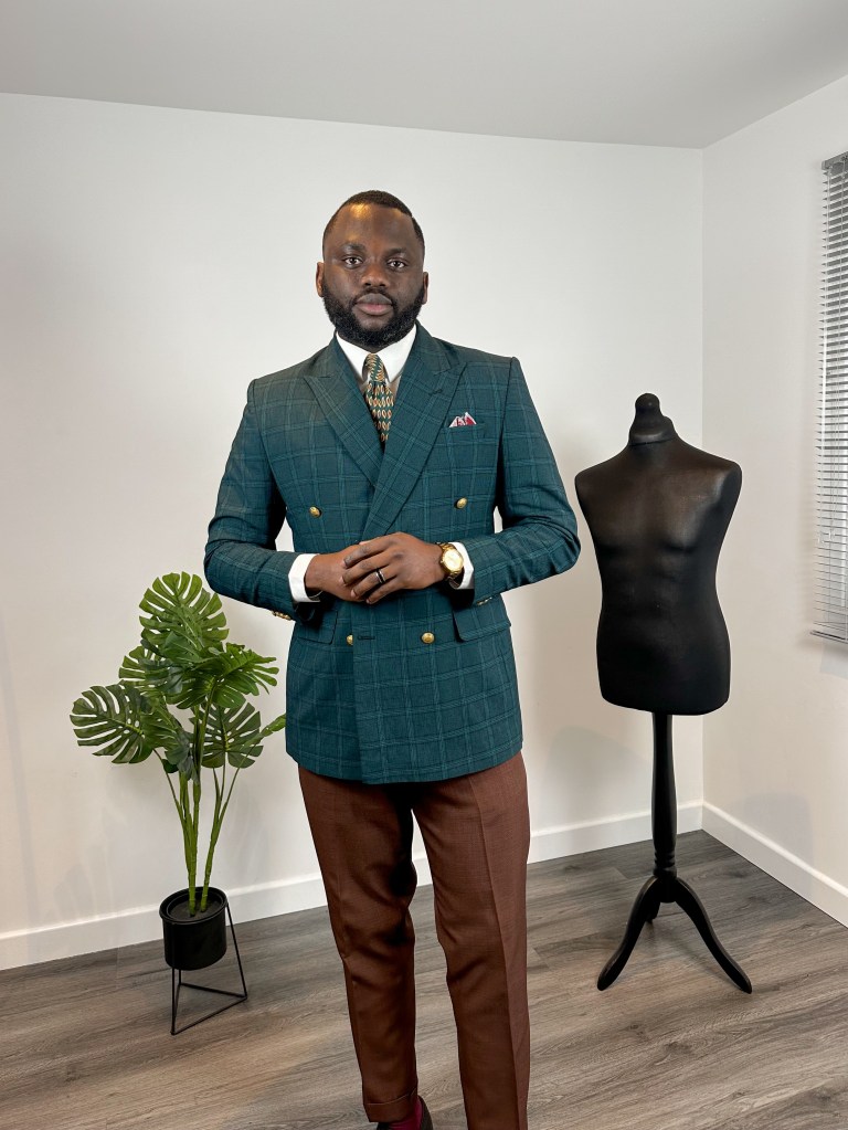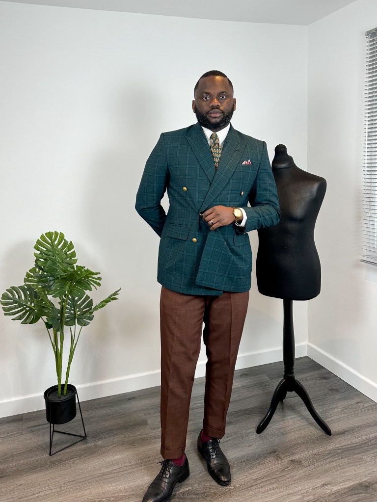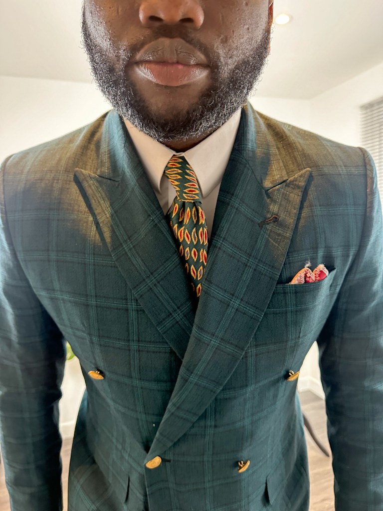 At the heart of this outfit lies a meticulously chosen tie, serving as the anchor for the entire look. Its verdant hue echoes the sophistication of the green checkered blazer by twelve19styles. Furthermore, the subtle hints of red in the tie seamlessly complement the pocket square and socks, adding a pop of color without overwhelming the outfit.