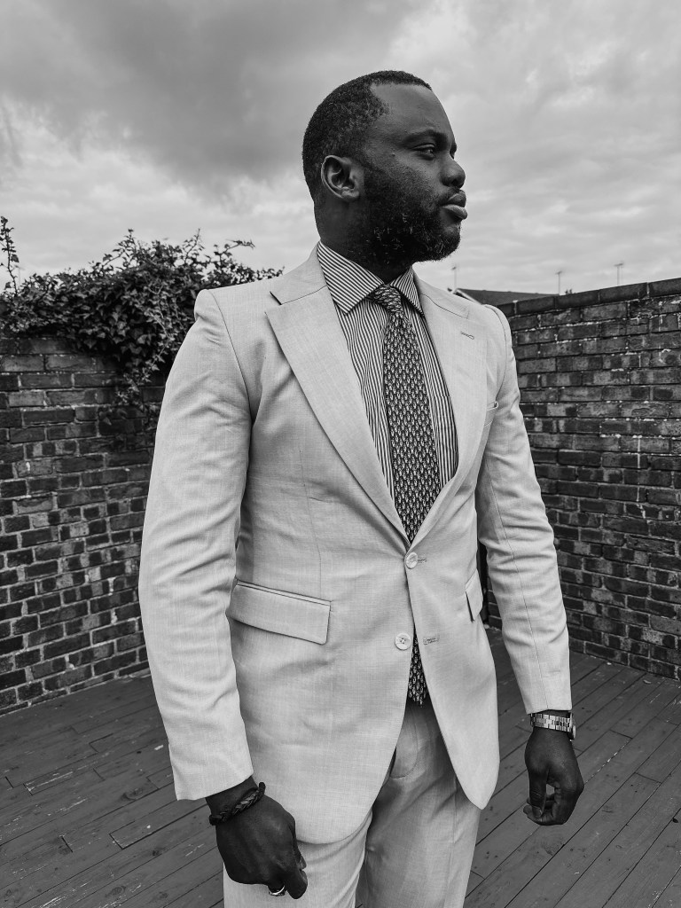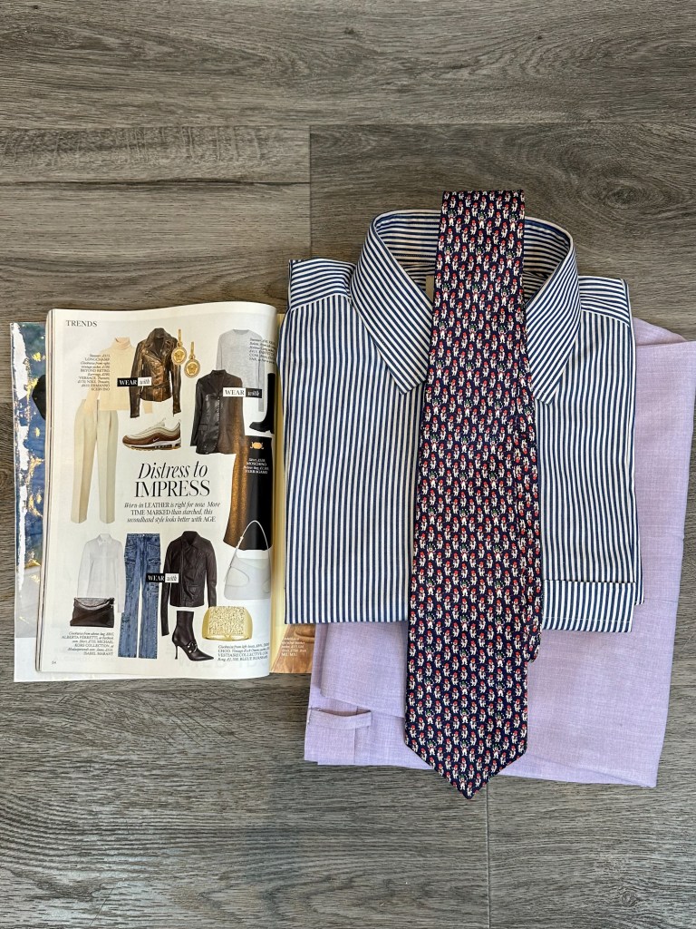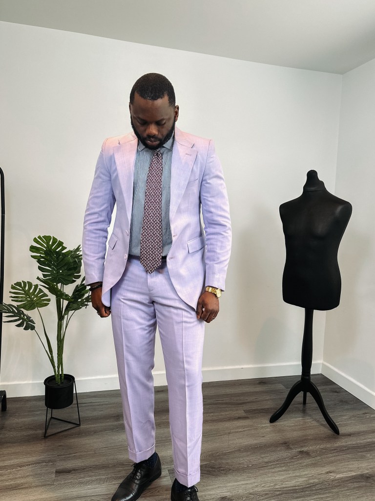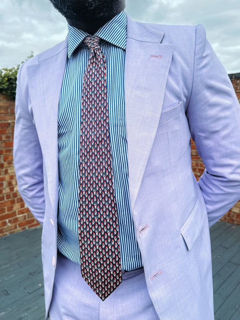 Creating the perfect outfit of the day is all about balance and coordination. For today’s look, I’ve chosen a blue stripe shirt paired with a lavender suit, accentuated by blue polka dot socks, and a blue tie with red details.
